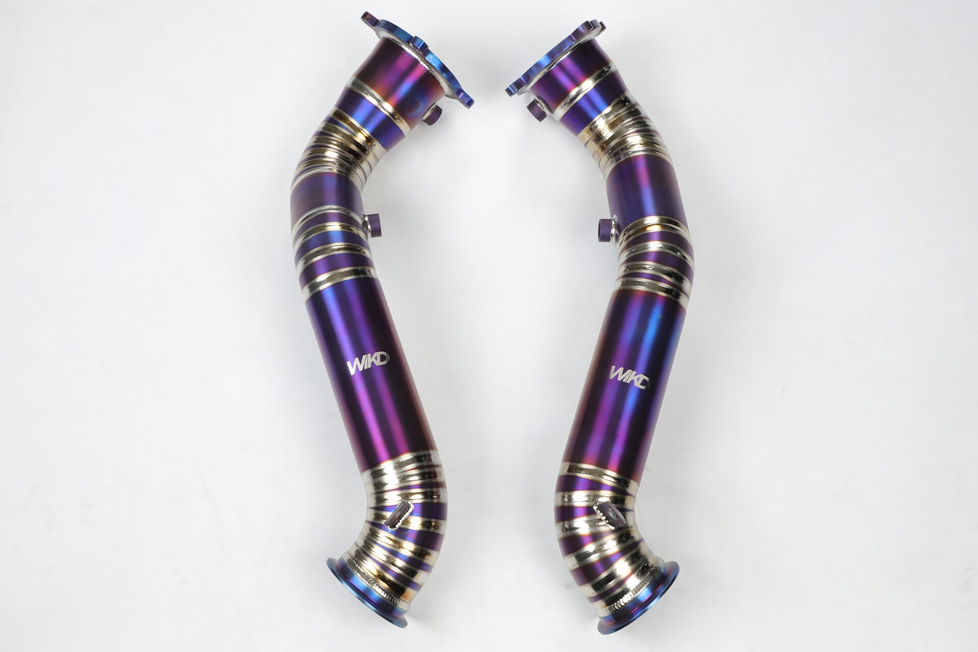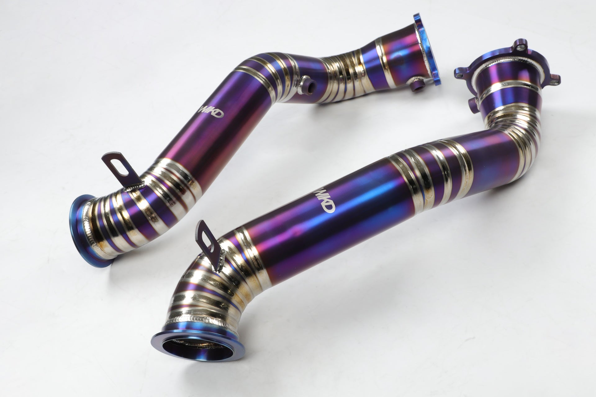 Designed with the highly desirable pie-cut aesthetic, each downpipe is precision laser-welded for uncompromising strength and flawless fitment. Finished in our signature Brushed Purple heat treatment, these downpipes not only deliver exceptional durability under extreme conditions but also provide a striking motorsport-inspired visual appeal.